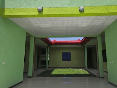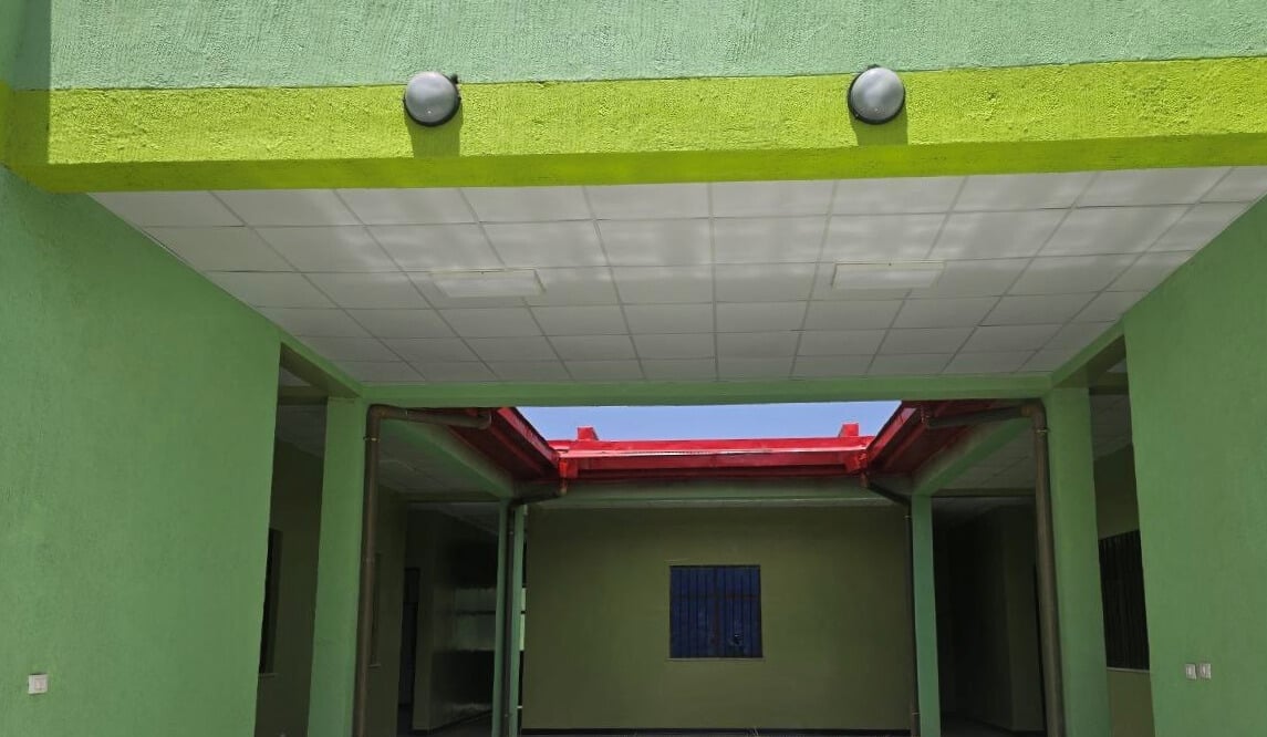The building is painted in bright, welcoming tones with a red roof that adds contrast and visibility. The open central atrium allows natural light and ventilation, complemented by neatly tiled floors, polished finishes, and structural columns for stability. The surrounding lawn area creates a natural touch, improving both aesthetics and environmental balance.